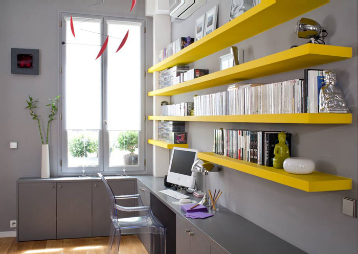 Birou Incorporat In Biblioteca Decor Cu Cutii Depozitare Pe Rafturi Diverse Modele De Tapet Forme Goemetrice Home Traditional Home Office Home Office Design